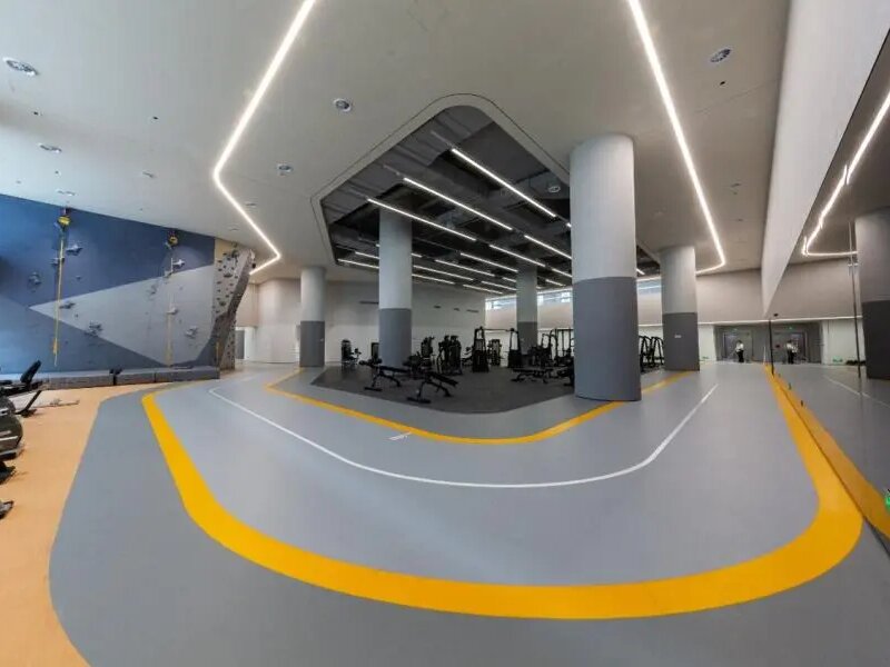休闲区聚焦身心舒缓需求,铺设洁福地板 Creation 55 高级装饰片材,哑光表面质感细腻,自然灵感木纹花色营造出质朴宁静的氛围,搭配 Protecshield 特殊维护处理与弹性层设计,既易于清洁打理,又能缓解长时间站立或行走的疲劳。运动区则配备洁福地板 Taraflex 运动竞技 7.5 与乐境 65 两款专业运动地板:前者凭借三重功能特殊维护处理专利技术,实现防污、防灼热擦伤、防阻滞与防滑多重优势;后者经 PUR Protect 特殊处理,6.5mm 复合压延工艺兼顾专业运动性能与耐污性,为员工运动安全与舒适体验筑牢基础。